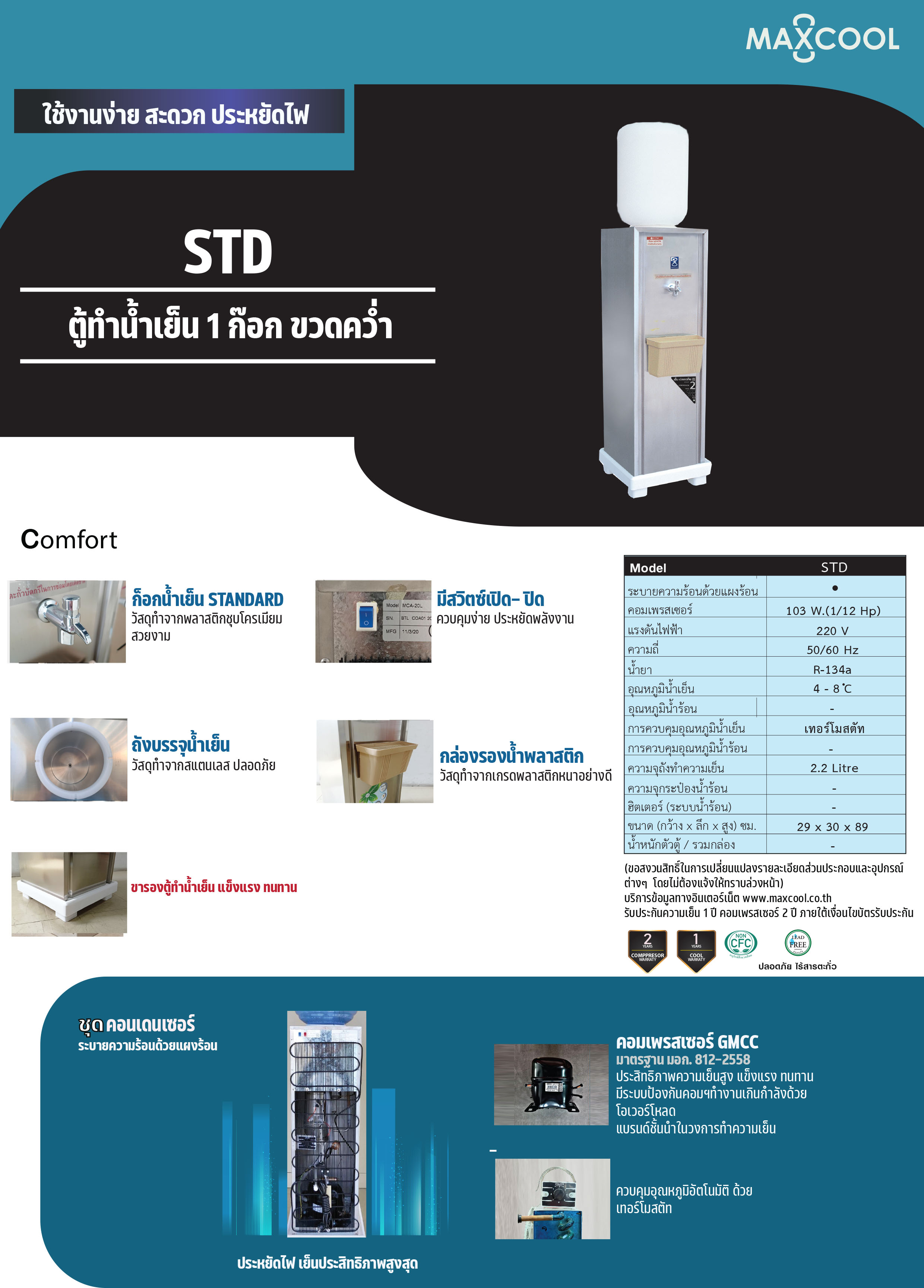 - ตัวตู้และถังบรรจุน้ำทำจากสแตนเลส- คอมเพรสเซอร์ ใช้น้ำยา R-134a NON CFC ไม่ทำลายโอโซน เป็นมิตรกับสิ่งแวดล้อม- ถังบรรจุน้ำเชื่อมอาร์กอนด้วยแขนหุ่นยนต์ ปลอดสารตะกั่ว- คอมเพรสเซอร์ รับประกัน 2 ปี- มีสวิตซ์เปิด- ปิด ควบคุมง่าย ประหยัดพลังงาน